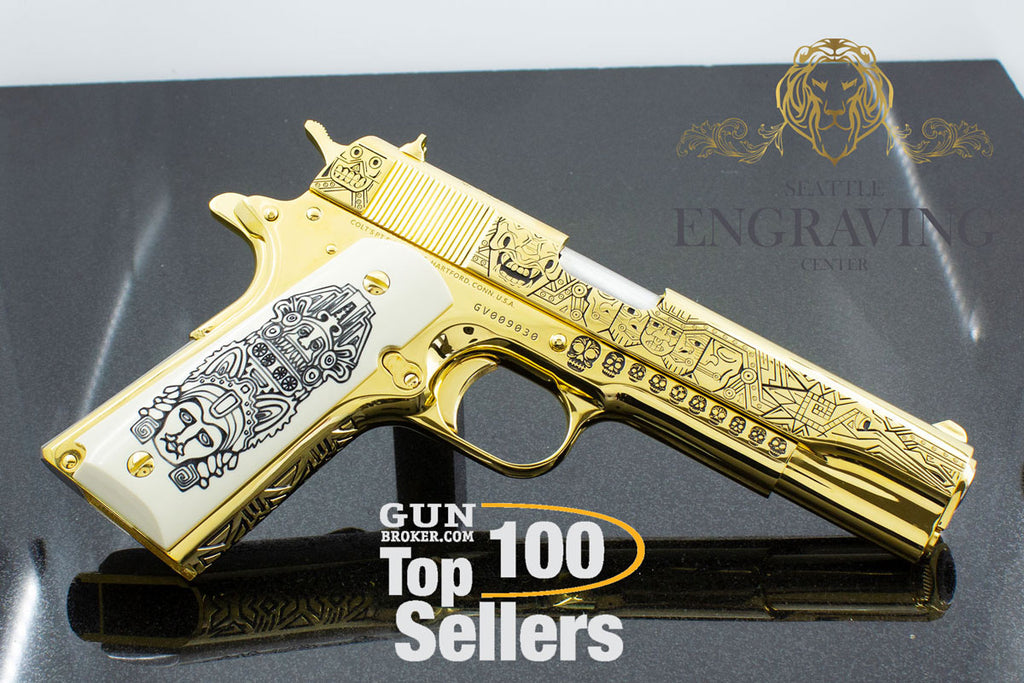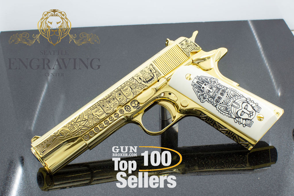 The grip is ivory polymer grip, engraved with Mexican Aztec design.