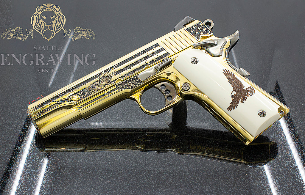 COLT Competition 45ACP is master engraved with our beloved American flag and Eagle Design. All engraving done in-house at Seattle Engraving Center, it is polished to a mirror finish and plated in 24K Yellow Gold and Black Nickel plated accents. This is a one-of-a-kind work of art.