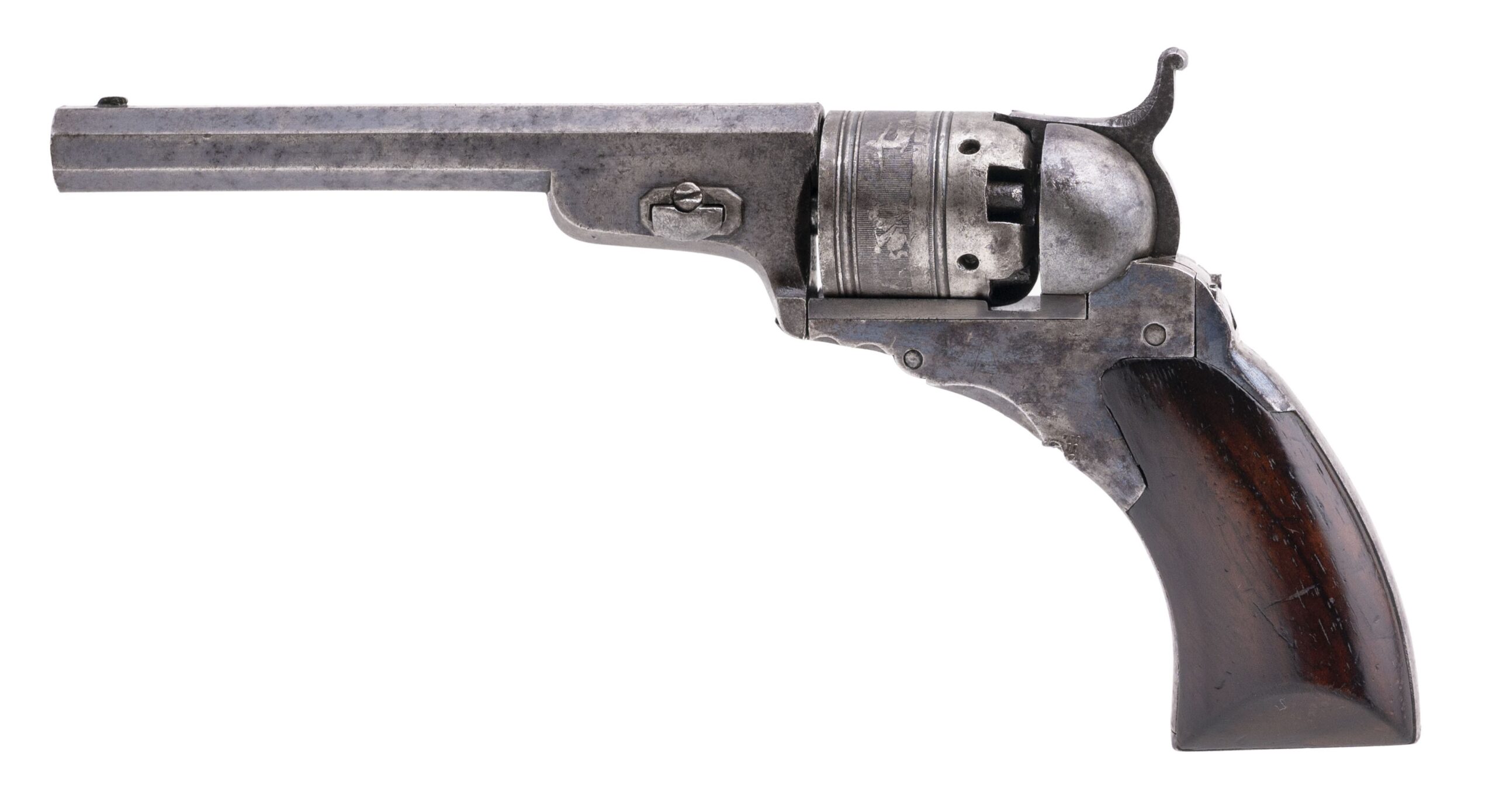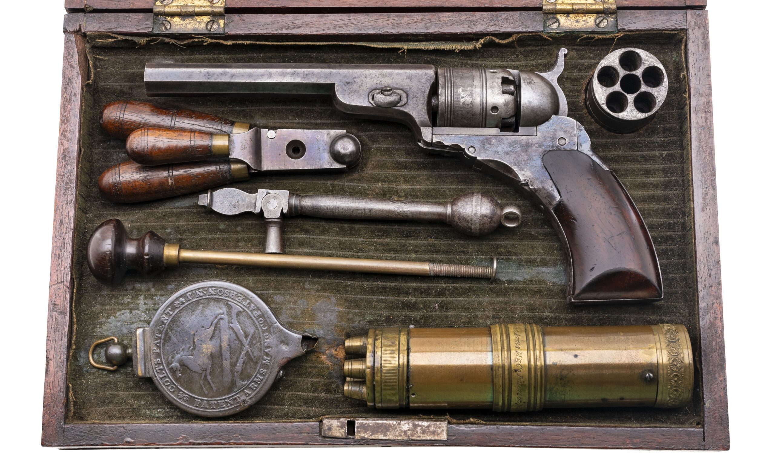 Serial number 165. Made circa 1836-1837. 28 caliber with a 4” barrel. Very nice sharp gun with Traces of original finish. Grips are very good. This gun comes with all original accessories. Very fine Cased baby Paterson!