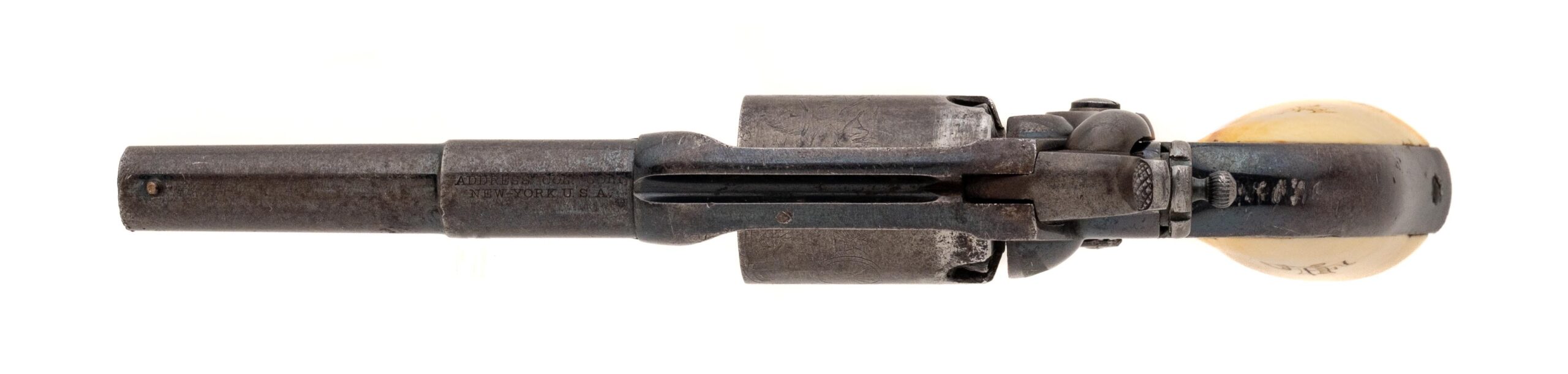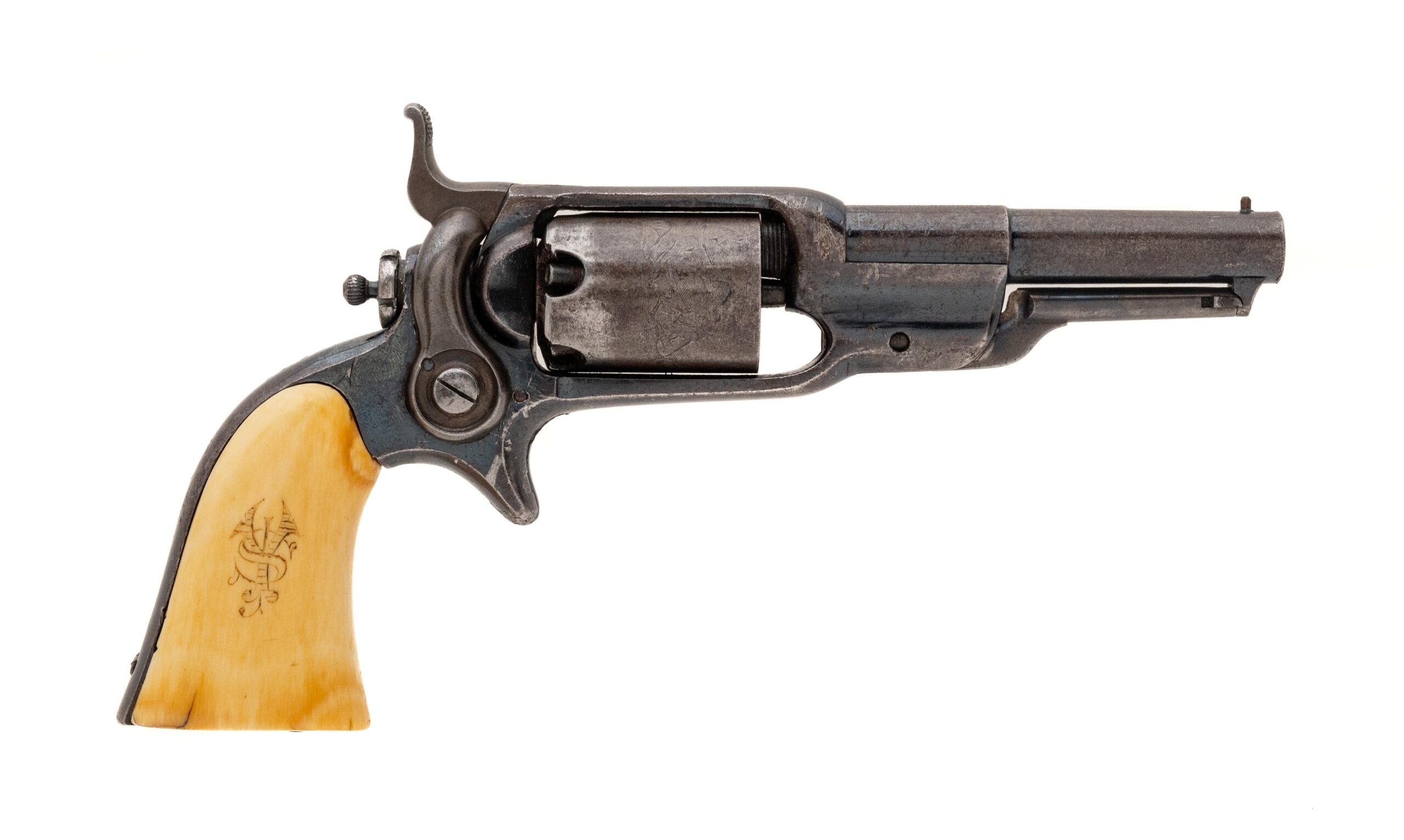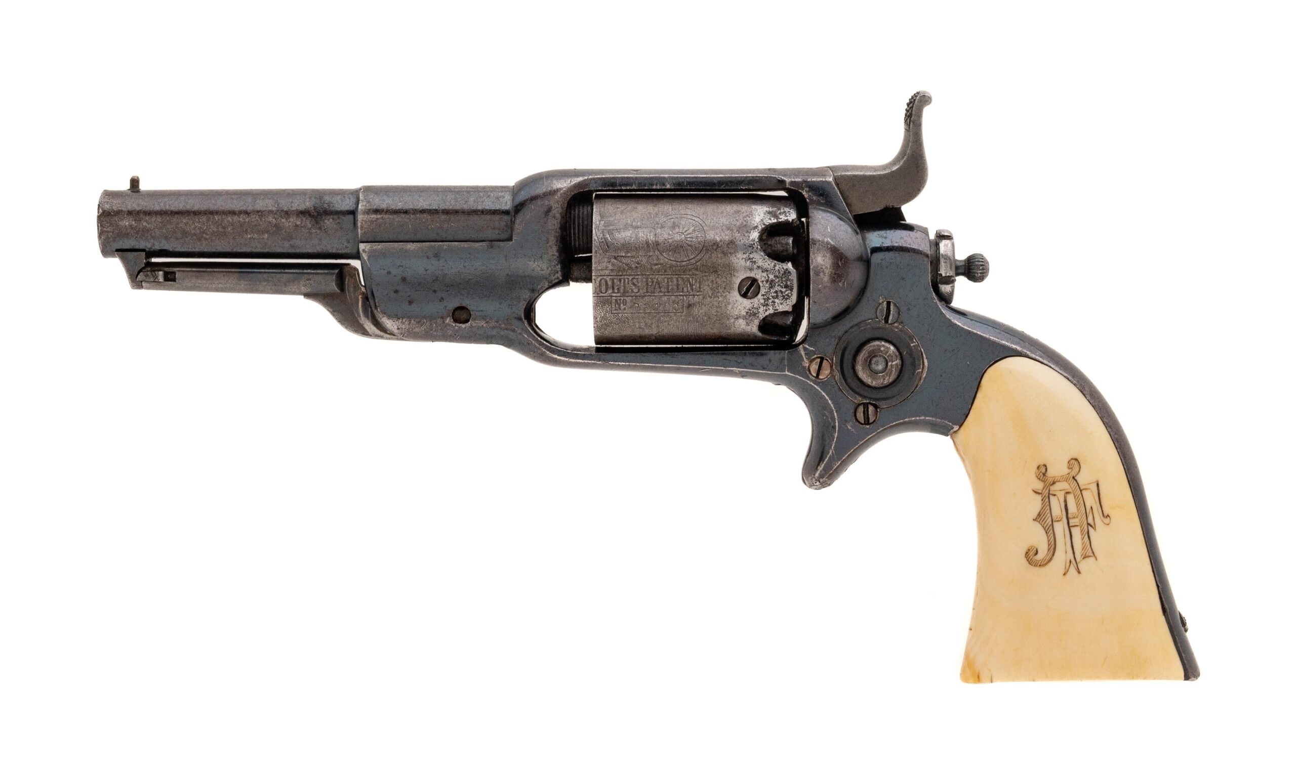 Serial number 13400. Made in 1869. 31 caliber with a 3 ½” barrel. This gun is in very fine condition with 50% of the original blue finish. Very good cylinder scene remains. Grips are one piece ivory with each side scrimshawed with initials. Most likely a presentation piece! (Consignment)