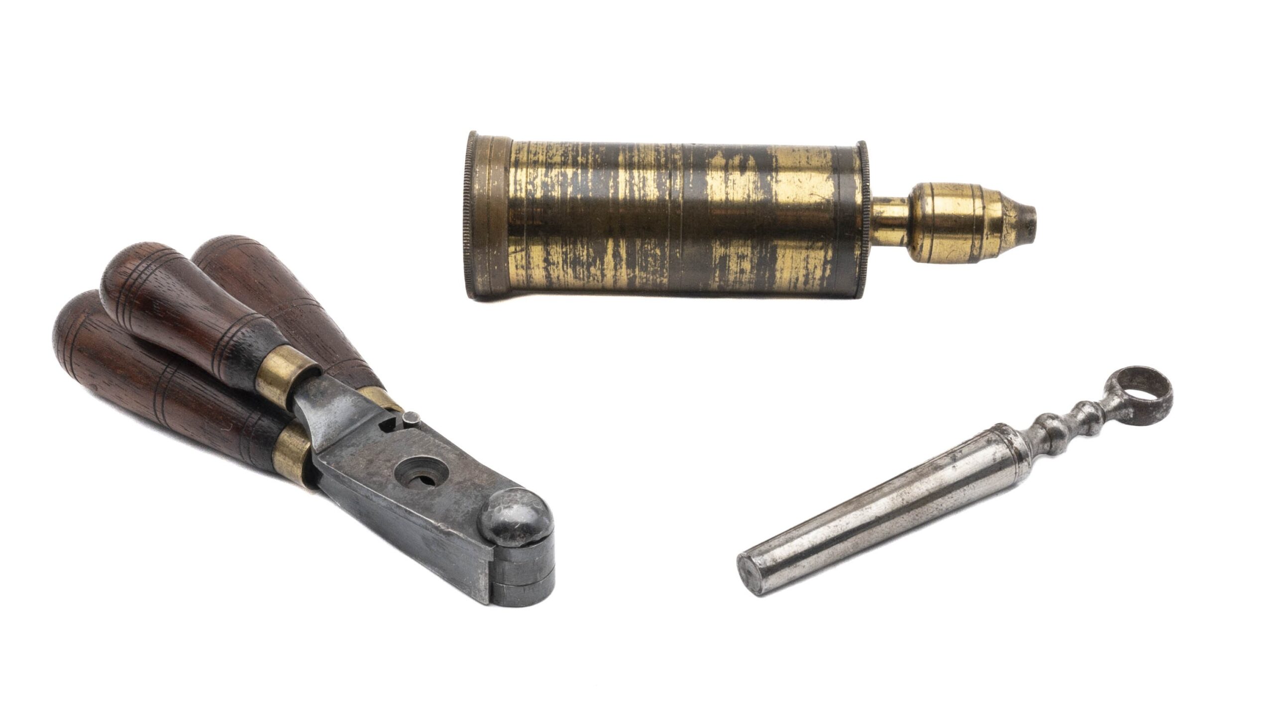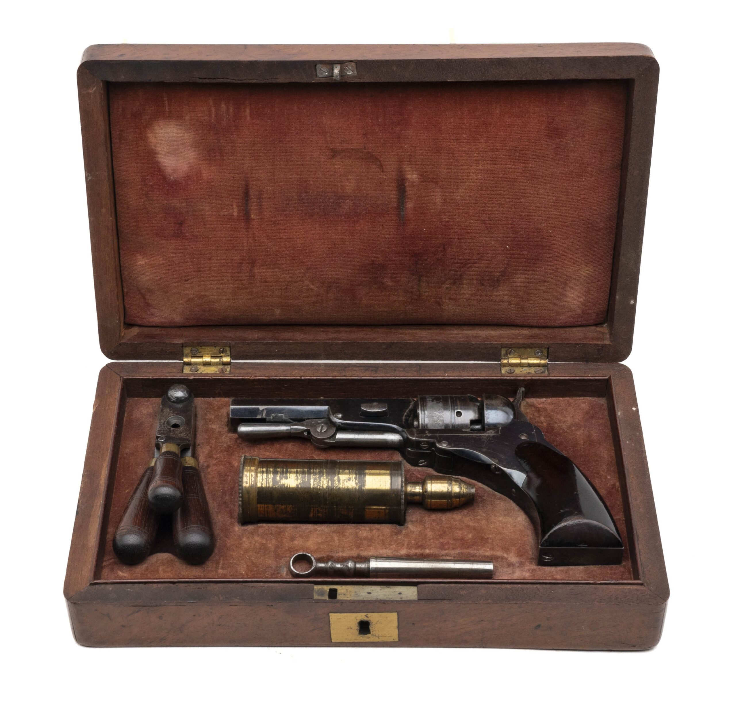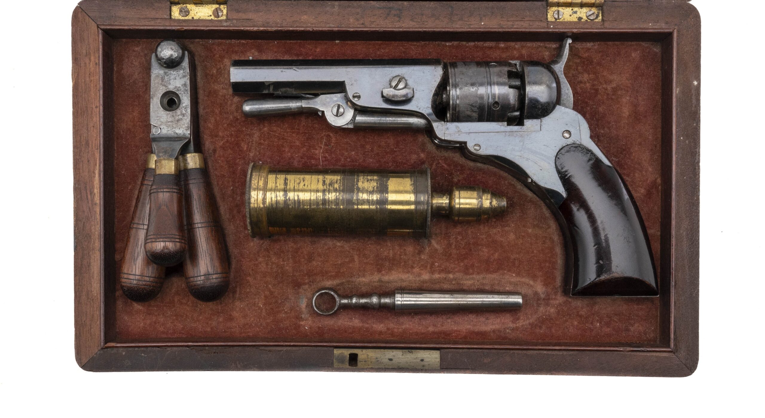 Serial number 24. 28 Caliber with a 3” barrel. Made in 1840. In excellent condition with 95% of the original blue. Grips are excellent. Gun is in fantastic condition. All accessories are excellent. The mold still has 90% + of its finish. The flask has 70% of its gold gilt. The oiler is most unusual which appears to be a combination of an oiler and a bullet worm. We have never seen one like this before, but it is clearly made for this set. Entire set looks unused. This gun came out of the Ben Ames collection which was handled by Jackson Arms back in 1960. At one time this gun also belonged to legendary dealer Bobby Smith. Fantastic Set!