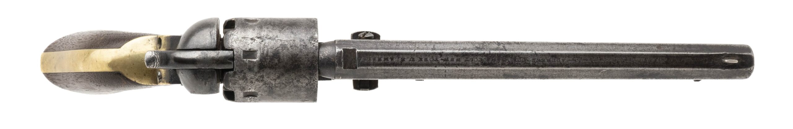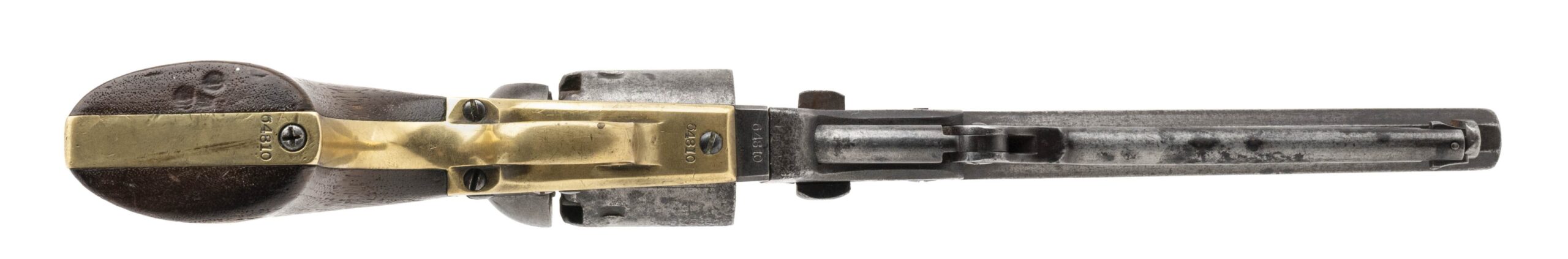 Serial No. 64810, made in 1856, .36 caliber, 7.5″ octagonal barrel. Metal is a grey patina with scattered areas of surface oxidation, most noticeably on the cylinder. Rear of the barrel has had a period dovetail for a sight added. Serial numbers are matching except wedge, cylinder serial number is faint. Grips are original with a light cartouche visible on the right grip. Action indexes correctly.