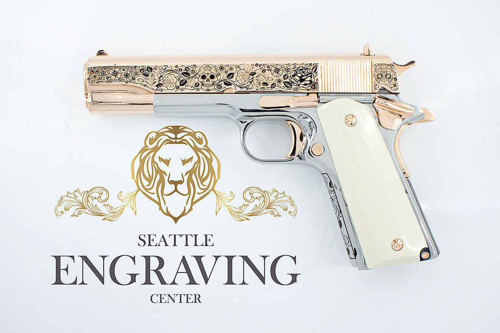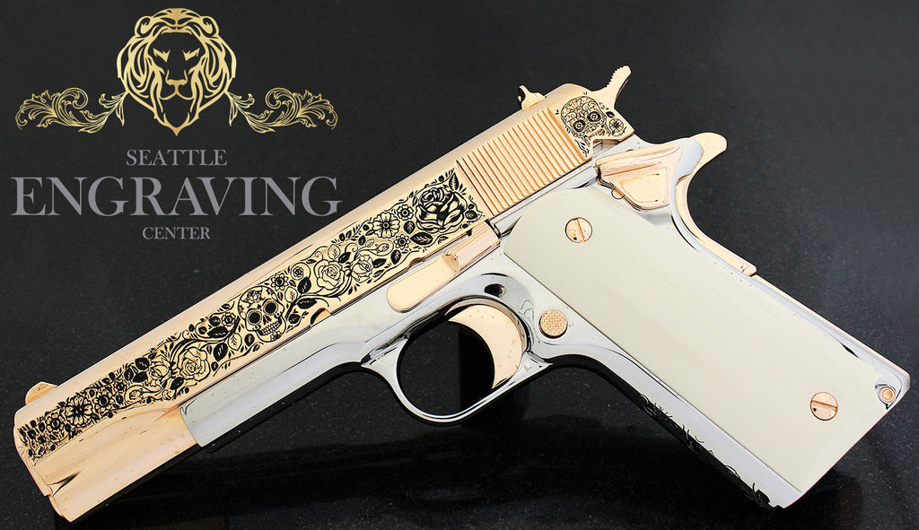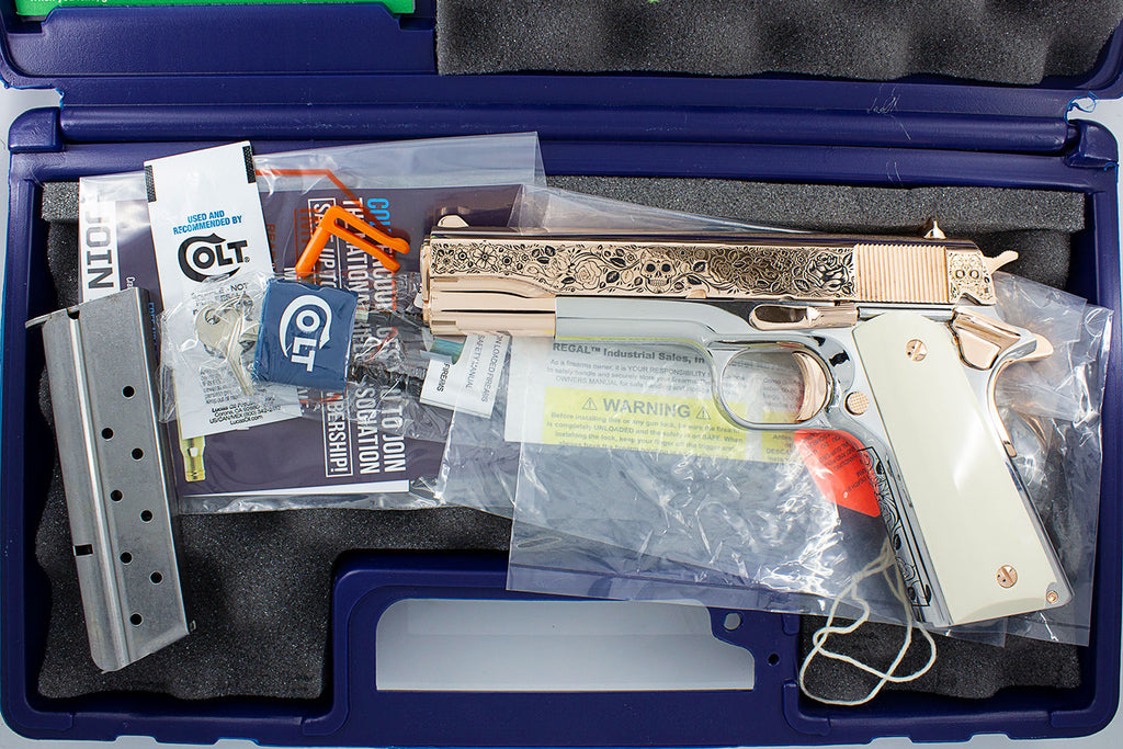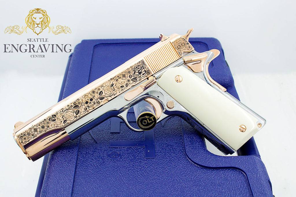 Buy Rare COLT 1911 Government 45 ACP Engraved with our Exclusive “DIA DE LOS MUERTOS” Design, 18K Rose Gold & 24K White Gold Plated online | Rare COLT 1911 Government 45 ACP Engraved with our Exclusive “DIA DE LOS MUERTOS” Design, 18K Rose Gold & 24K White Gold Plated for sale