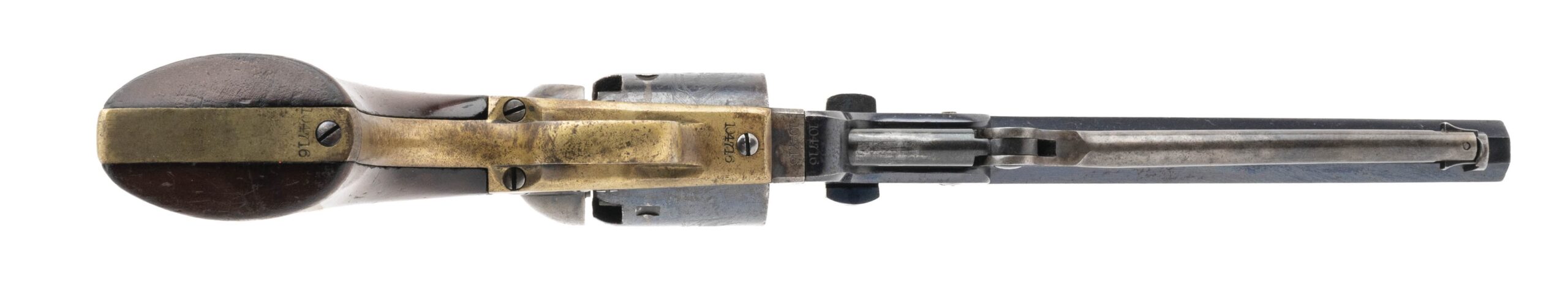 Serial number 104716. Made in 1861. 36 caliber with a 7 ½” barrel. This is a very fine example with 90% of the original blue on the barrel. The frame still has most of the case colors. The cylinder has all of the scene and has approximately 70% of the original blue. This is a civilian model and there is still approximately 90% of the original varnish. This gun is all matching. Very fine original Colt 1851 Navy!